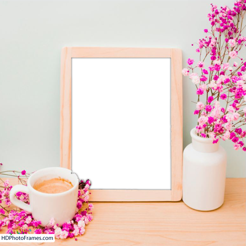 An amazing wooden frame for photo and surrounding area decorated with a cup of tea and vase.